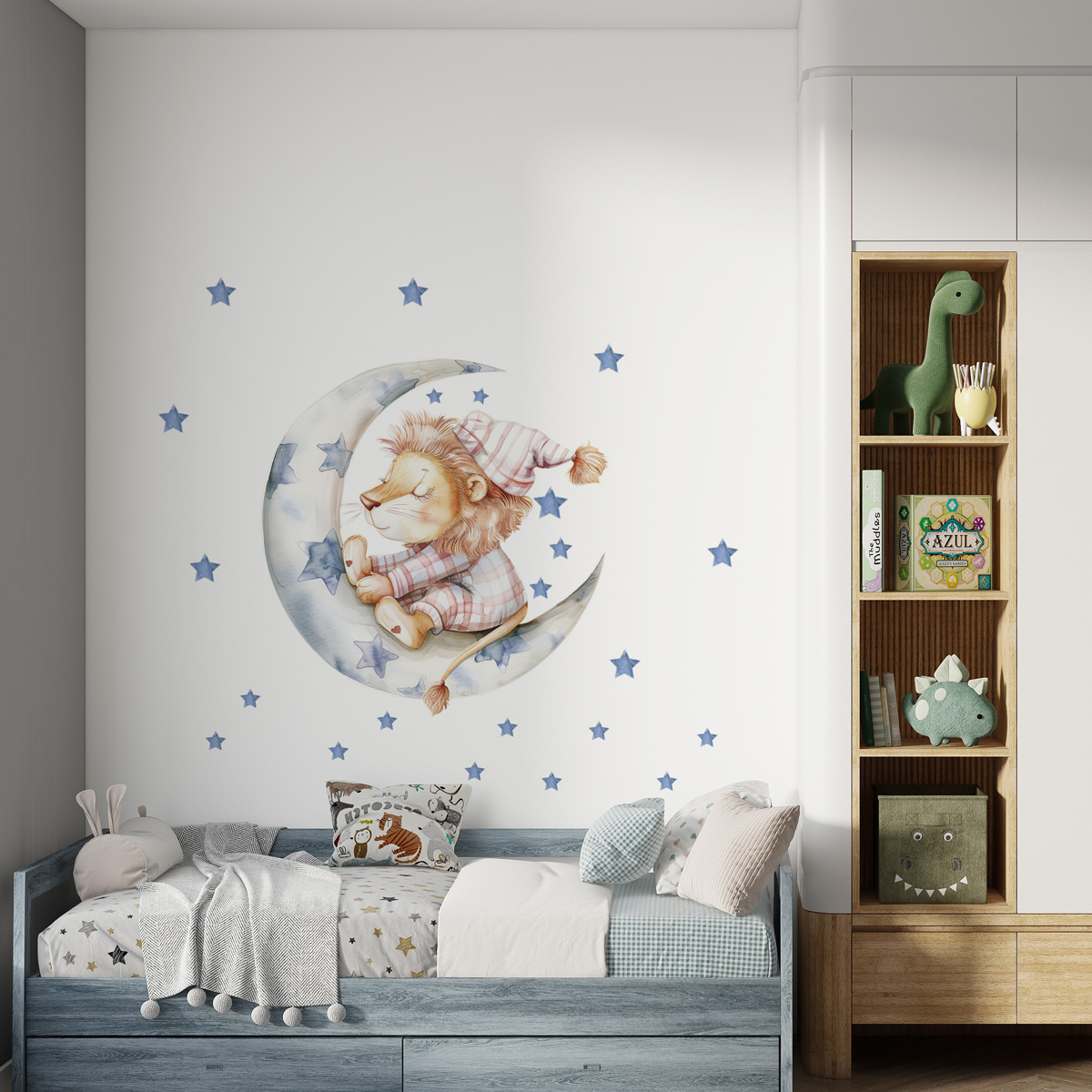 Ova predivna zidna nalepnica u akvarel tehnici prikazuje slatkog lavića kako spokojno sedi na mesecu, okružen mnoštvom zvezdica. U nežnim tonovima koji unose mir i toplinu u dečiju sobu, lav na mesecu je savršen dodatak za mališane koji sanjaju o beskrajnim avanturama i čarobnim svetovima. Dizajnirana da lako prianja na zid, ova nalepnica će prostoriji dati jedinstven, bajkovit izgled.